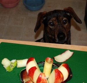 Another "helper" hoped I would drop some apple so he could help clean up.