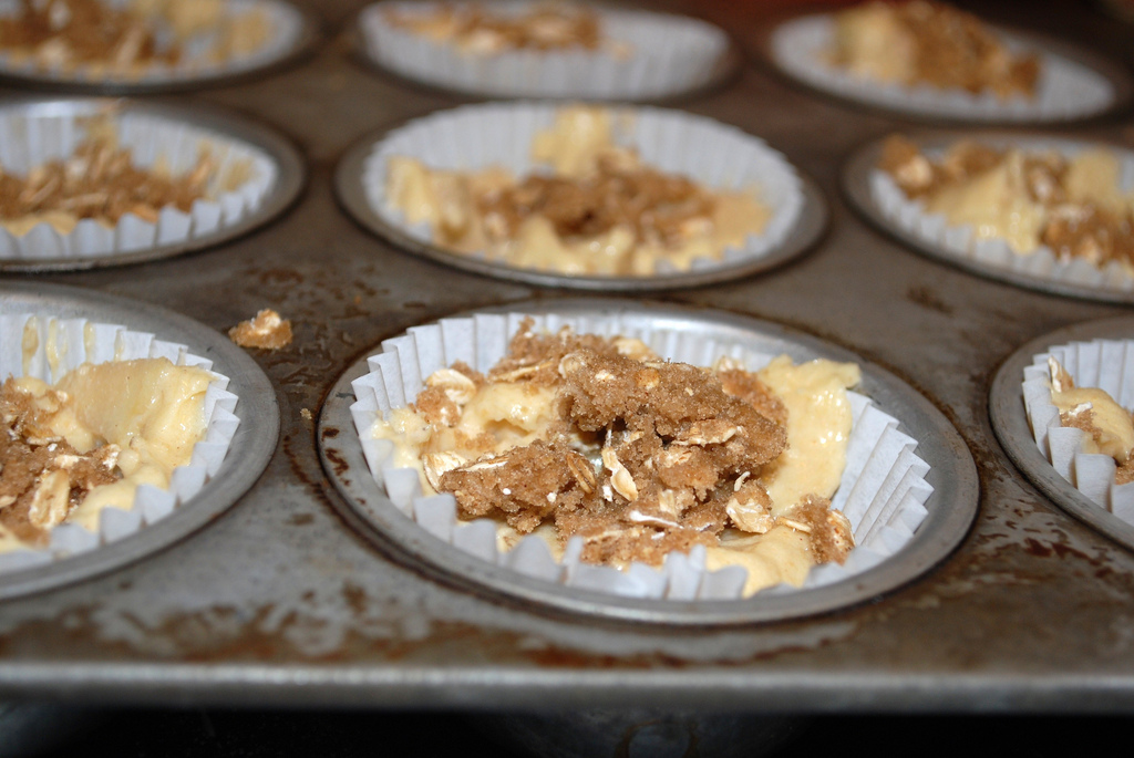 Fill cupcake pans with batter and then top with some of the oatmeal mixture.  I ended up with 15 cupcakes.