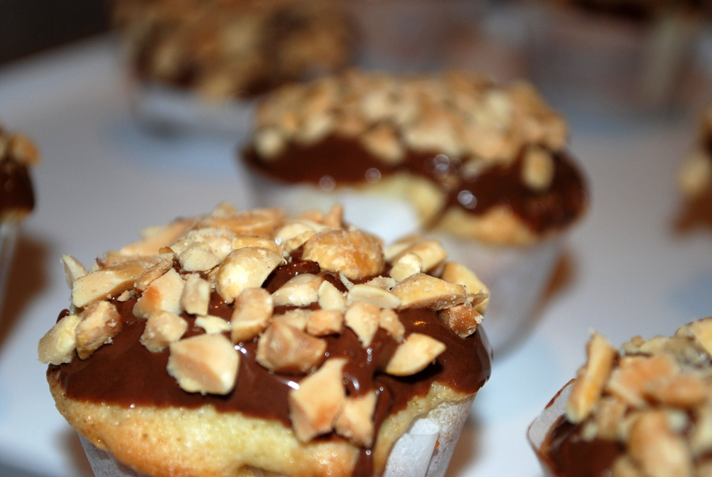 After filling, I melted some milk chocolate chips and crushed some dry roasted peanuts.  I dipped each cupcake in the chocolate, then into the peanuts.