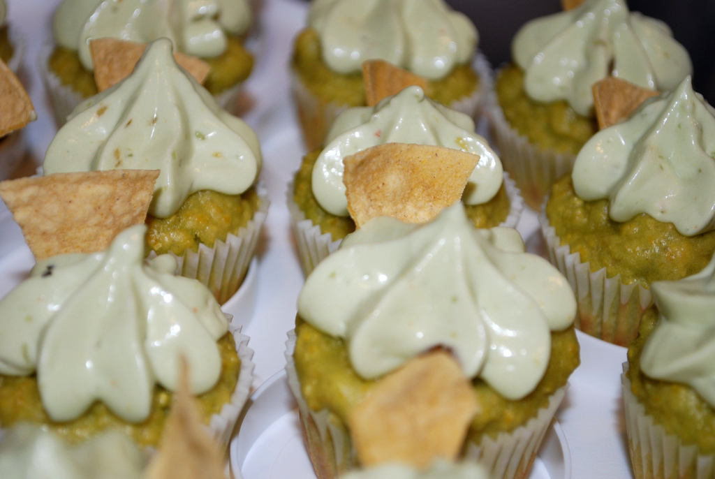 Taste: Great job of layering…sweet of the icing(caught me a little off-guard at first)…savory flavor of the avacado in the icing, then in the cake…slight sense of sour cream(done with cream cheese!)…Decorative chip on top soft, but I understand that any tortilla chip will go soft once left out in the open…I have enjoyed the “corn meal” style muffins that Mrs Shuck has made.