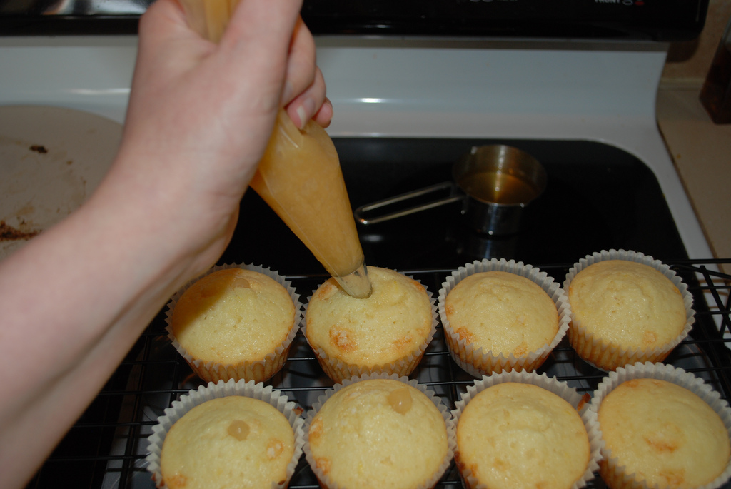 Using a pastry bag and a small tip, I squirted lemon curd into the center of each cupcake. In retrospect, I should have cut out a cone to ensure that I had enough curd in each cake.