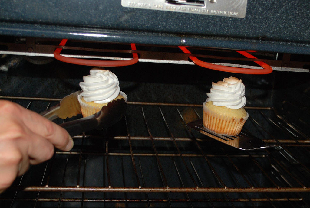 I used an Italian meringue for the top. I boiled a cup of sugar with 1/3 cup of water until it reached 240 degrees, then poured it into the mixer bowl where I had whipped 5 (pasteurized) egg whites to soft peaks. I beat the mixture until it cooled, then piped it on top of the cakes. Unfortunately, neither Mr Shuck nor I could get the kitchen torch lit with the one match I was able to scrounge up, so Mr Shuck and his friend held them close to the broiler coil in the oven.