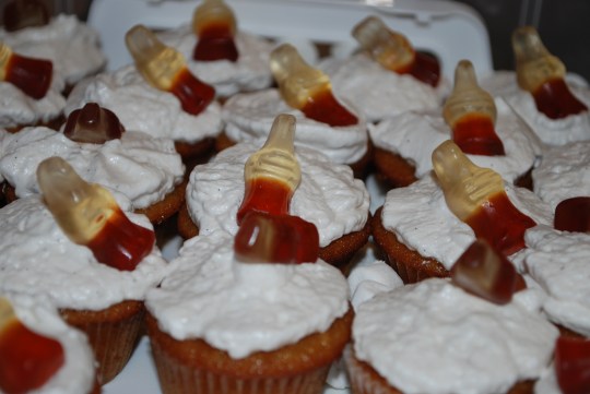 I piped the icing onto the cakes using a flat tip as I was hoping for a relatively flat icing. (Liquids don’t mound up.) I garnished with a gummy cola bottle which I hope is tasty. (More gelatin, so I don’t eat them.)