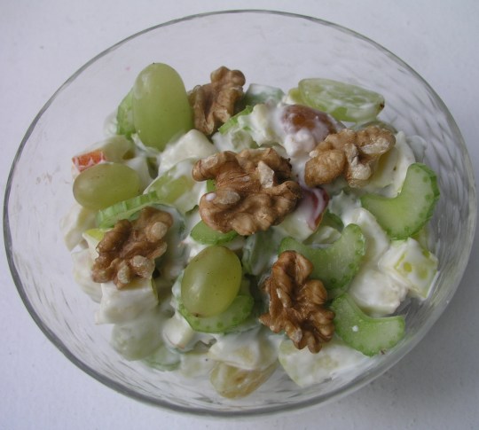 Waldorf Salad has 5 ingredients: Apples, grapes, celery, walnuts and mayo. I dislike 40% of these ingredients. I’ll let you guess which ones. I could give you details about the origination of this salad, but I’d just be plagiarizing Wikipedia, so if you’re that interested, click here.