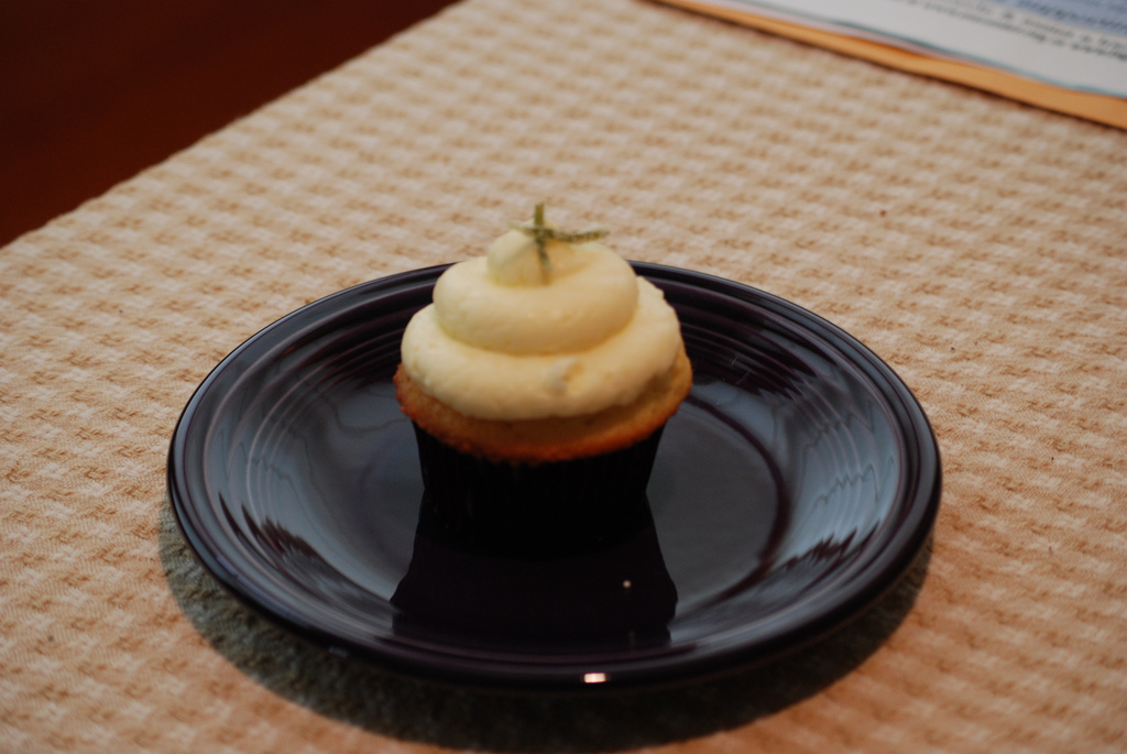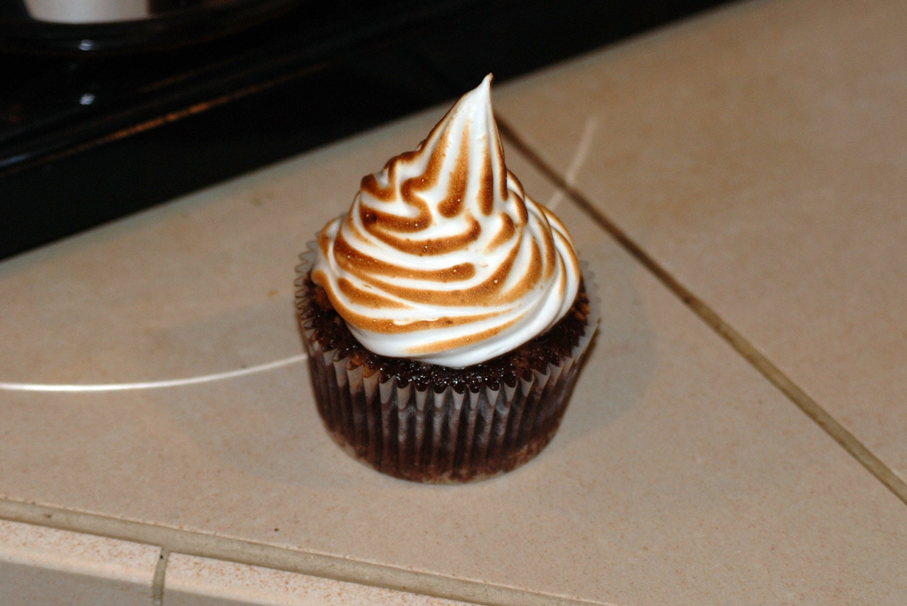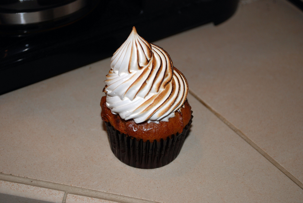 So, today I used my Williams Sonoma gift card and purchased a kitchen torch and a pastry bag. Goal: Cupcake perfection. We had a test cupcake at Trophy for comparison. I made the cupcakes and icing. James operated the kitchen torch as it made me a bit nervous.