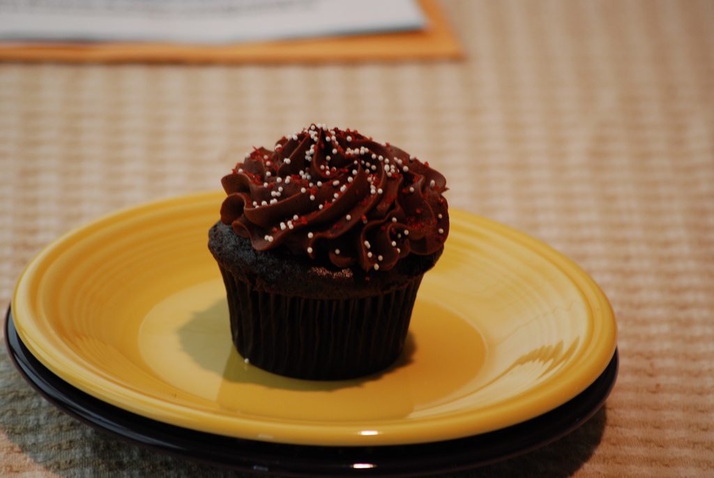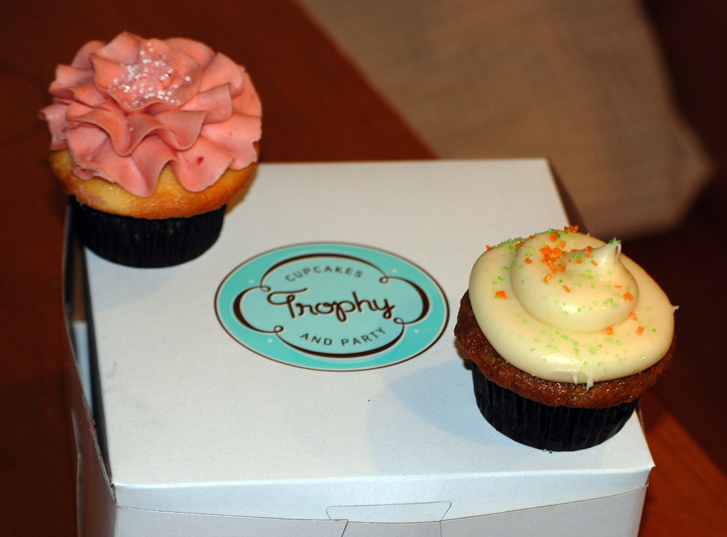 Last week was Cinco de Mayo, so that meant new flavors at Trophy. Can I just say, “YUM!” The margarita cupcake was lime cake with tequlia lime buttercream. There was a sprinkling of salt and some candied lime zest on top. The Mexican chocolate was a rich chocolate cake with chocolate buttercream with a hint of cinnamon and cayenne. There was just enough cayenne to warm the back of my throat but not my tongue. I realized today as I was taking pictures of the dogs that I had the camera on “action”. Probably why I had trouble focusing on the cupcakes. They didn’t move very much!