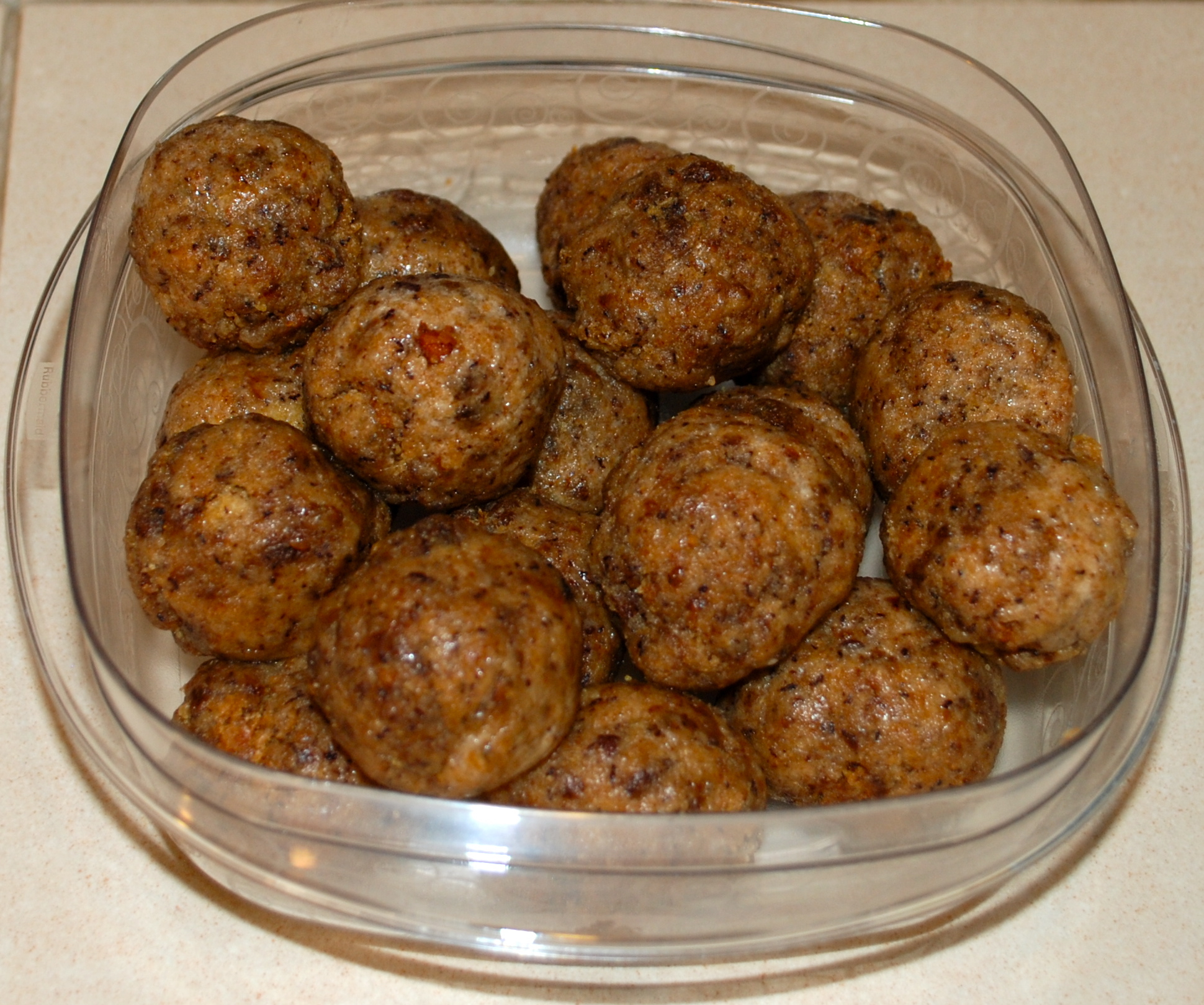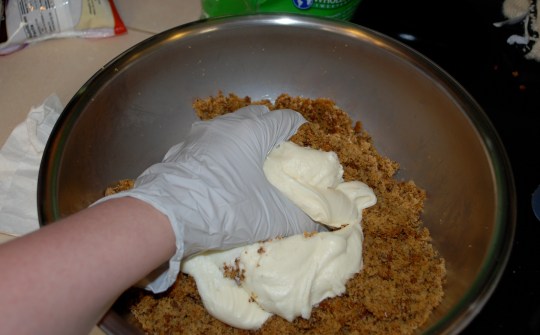 I wanted to make sure the truffles were truly truffles so I made a little more ganache, using a little less cream than usual since I was adding the cream cheese frosting. I probably used 2 & 1/2 ounces of cream with 8 ounces of chocolate. I combined this with the cream cheese icing while the ganache was a little over room temperature. I mixed this into crumbled cake made yesterday. I used a 1 ounce portion scoop to measure out uniformly sized quantities of cake mixture and rolled them into balls with gloved hands. They went into the freezer on a Silpat covered cookie sheet until the next day…