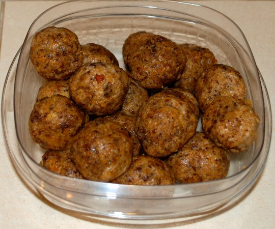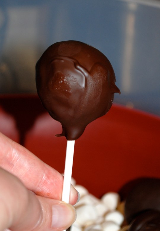 I skewered each truffle ball, dipped it into the melted chocolate and then either dipped into the garnishes or sprinkled on the garnishes while the chocolate was still melted. I had to work fairly quickly to get the balls coated while the candy was still wet. I set the skewers in a glass until the chocolate was solid. I only have 4 skewers, so while each batch solidified, Mr Shuck and I would scour the cabinets for something different to try. When solid, I put them onto a cooling rack. When I ran out of chocolate, I melted down the rest of the bag of Vanilla Candy Melts. When I ran out of that, I put the truffle balls back into the freezer for another day…