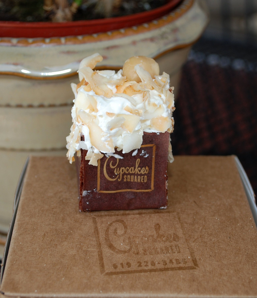 I had higher hopes for the hazelnut mocha cupcake. It was pretty in a simple way. I love coffee. I love hazelnuts (well, I love Nutella, I don’t normally eat a handful of hazelnuts). Unfortunately, this cupcake tasted like neither. In fact, the most dominant flavor I sensed was “banana”, but maybe there is something wrong with my taste buds. Apart from the lack of distinct flavor, the cake was fine. It wasn’t bone dry. It was okay. The icing was a little grainy, but not overly sweet. There was a nice crunch from the crushed nuts on top. I’ve thrown away cupcakes that were worse. I ate my half of it. Mr Shuck thought it was fine, just a little dry.
