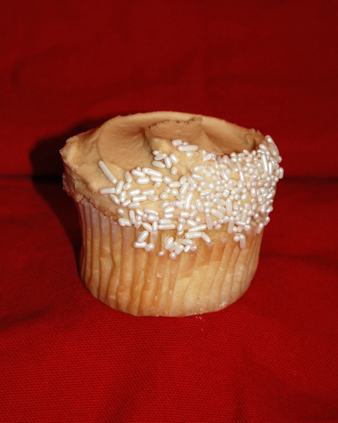 Sir Turtle: Chocolate cake with ganache frosting with caramel and pecans. There was a tiny amount of ganache filling inside very dry chocolate cake. The icing was a glimmer of a bright spot: like a tiny taste of truffle. It wasn’t enough shine to bring this cupcake up to “good” though. I only ate half of it.