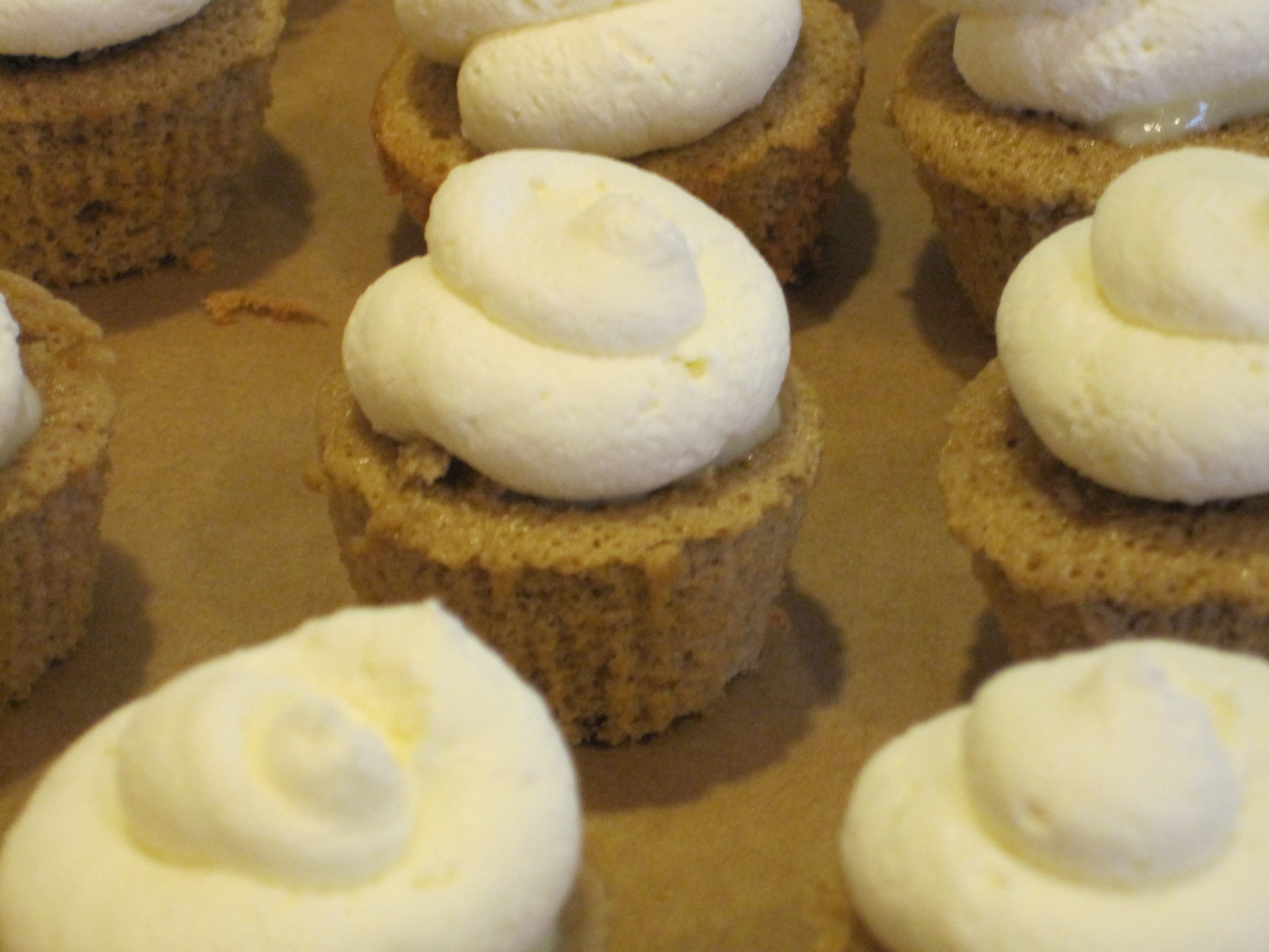 The 1st 4 ingredients were combined and beaten in the Kitchen Aid until the mixture was thick and fluffy. (The recipe described this as “falling in ribbons when the beater is lifted”.) I sifted the flour into the bowl in a few parts , gently folding until incorporated after each addition. I should have added the oil after the flour. I used a small scoop to put the batter into the pans and baked for 7-8 minutes. (Cake tester/toothpick should come out clean and cake should start to pull away from pan. In this case, the liners contracted away from the sides of the pan.) These cooled for 10 minutes in pan, then 20 minutes more on racks.