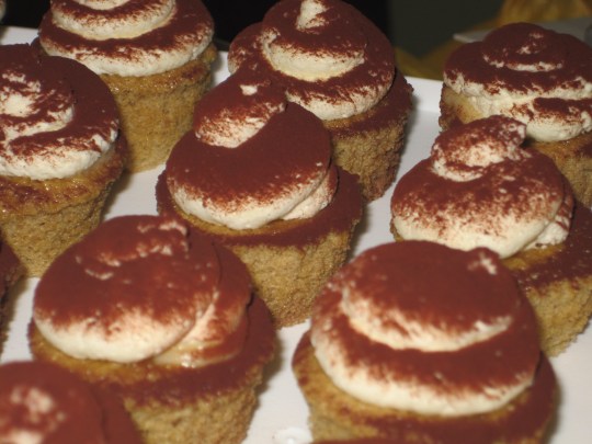 According to Wikipedia, tiramisu is made of biscuits (lady fingers, a small sponge cake) dipped in coffee, layered with a whipped mixture of egg yolks and mascarpone, and flavored with liquor and cocoa. Cupcakes are eaten out of hand, not with a fork, so I didn’t want them dipped in coffee. I decided to do a coffee flavored sponge cake instead. Marsala wine or rum is commonly used as flavoring. I knew that I’d end up using the rest of the rum (with some pineapple juice, yum!), so I went with that instead of the marsala wine. I didn’t want to serve raw egg yolks, so I decided to use a custard instead and filled the cupcakes with a rum custard. I would ice them with a whipped mascarpone icing and sprinkle the tops with cocoa powder.